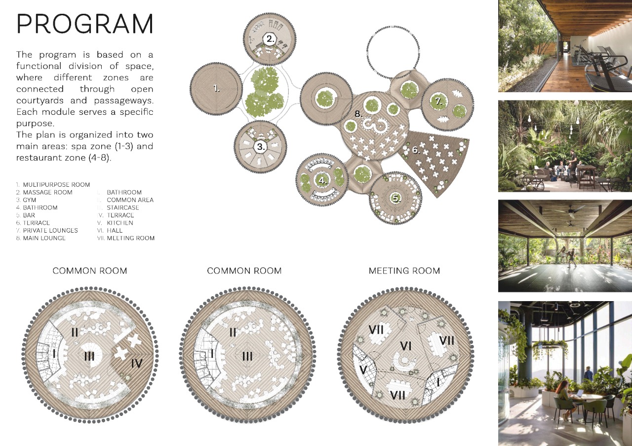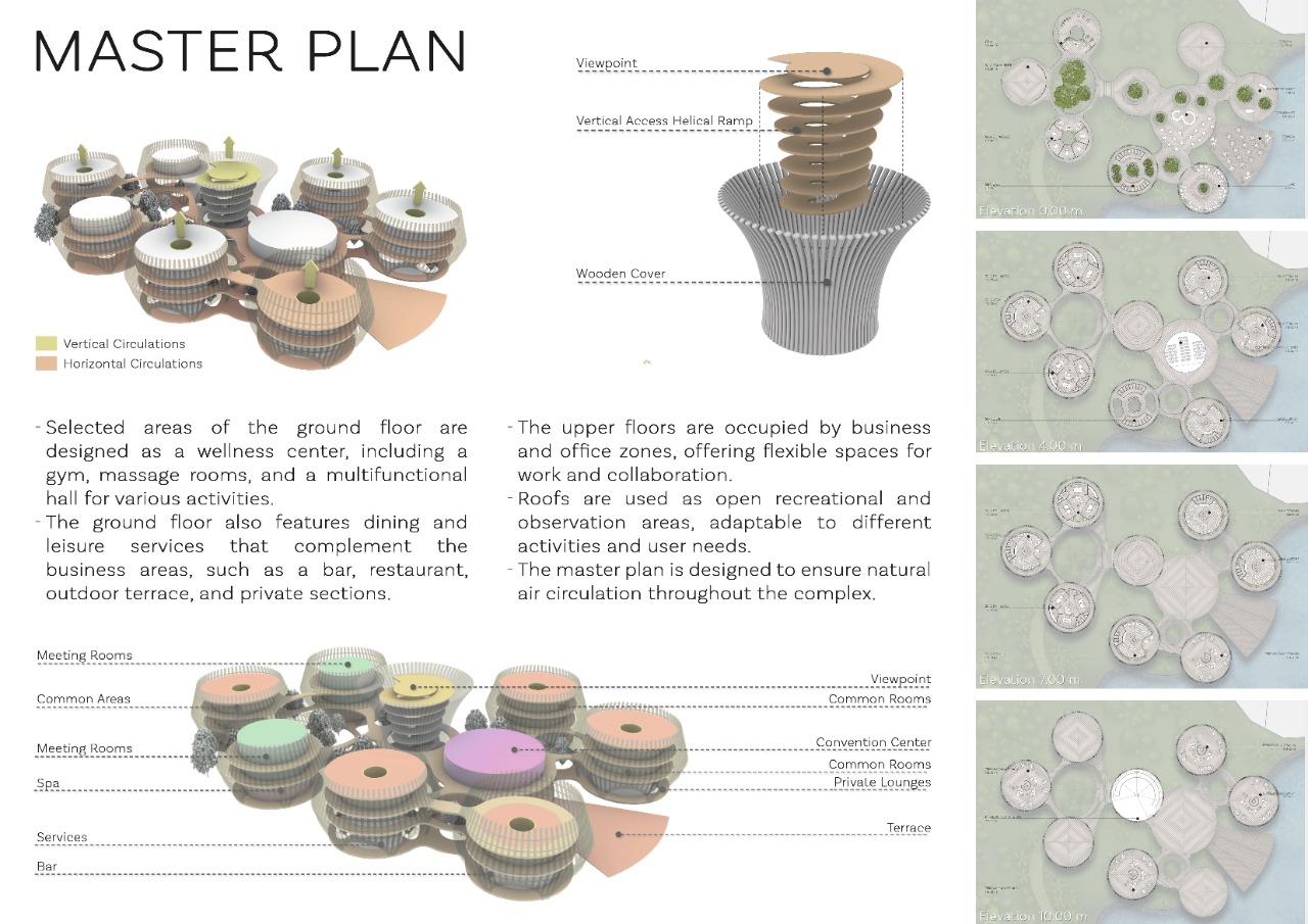 The architectural program seeks to balance wellness, contemplation, and functionality. On the ground floor, a 1,412.53 m² hospitality area houses a restaurant, bar, terraces, and private spaces that complement the project’s business and relaxation amenities. A two-level common hall (246.15 m²) and a meeting room (127.59 m²) provide flexible areas for gatherings, meditation, or community activities.