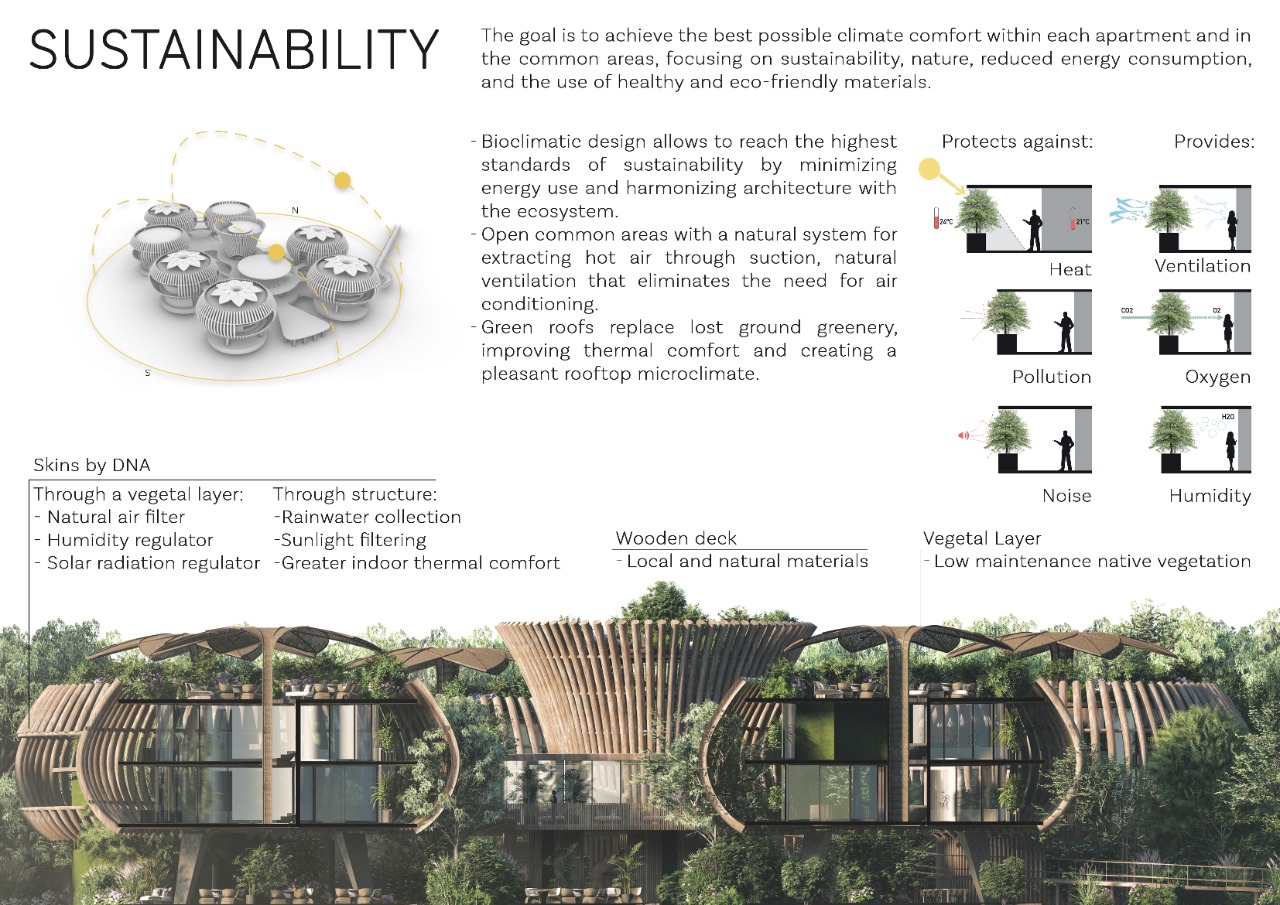 Bioclimatic design is the backbone of the project: passive strategies, cross-ventilation, and local materials allow for high sustainability standards. Thus, the Holistic Center minimizes its energy footprint and merges with the ecosystem, transforming architecture into a living extension of nature, where every element breathes, protects, and connects.