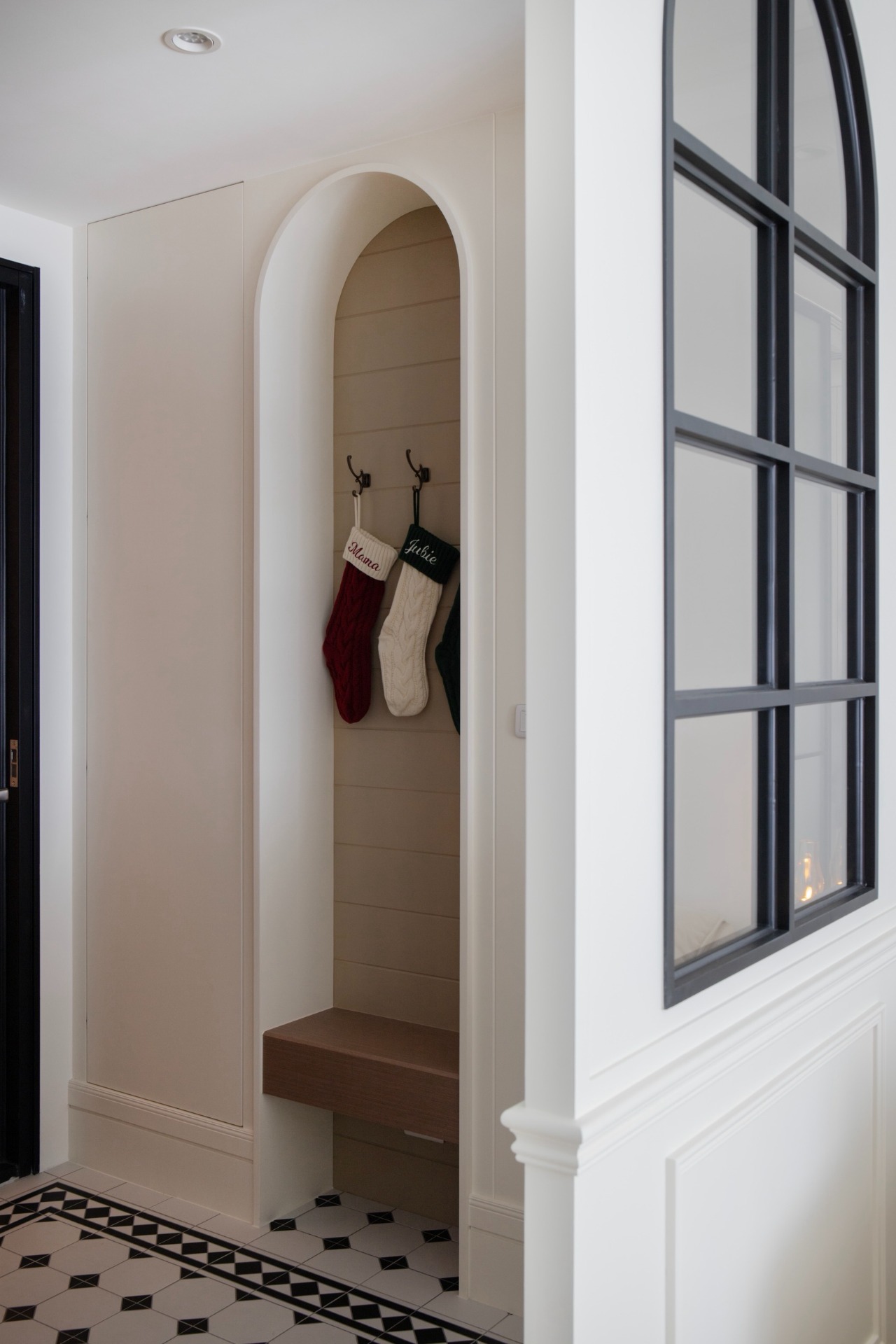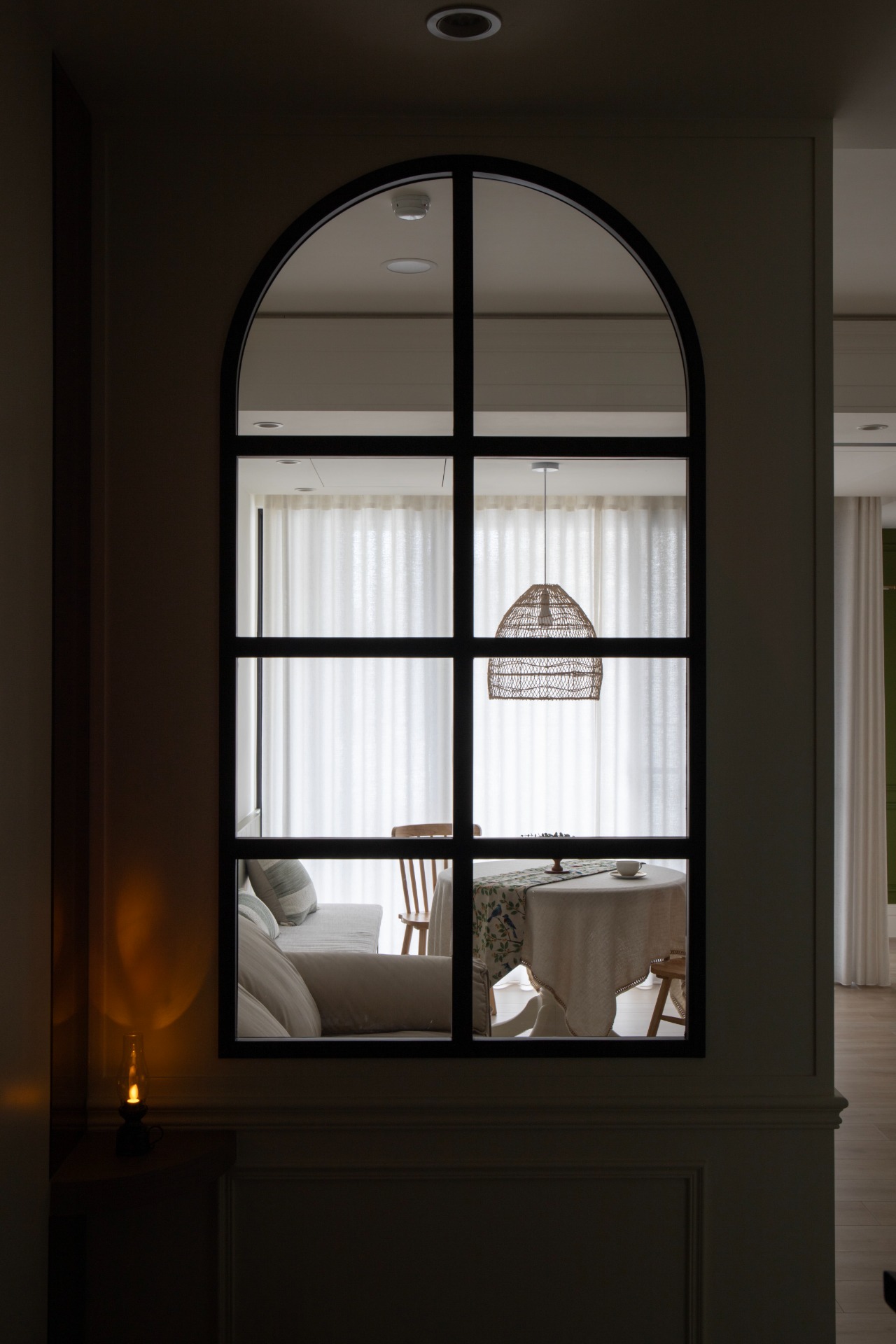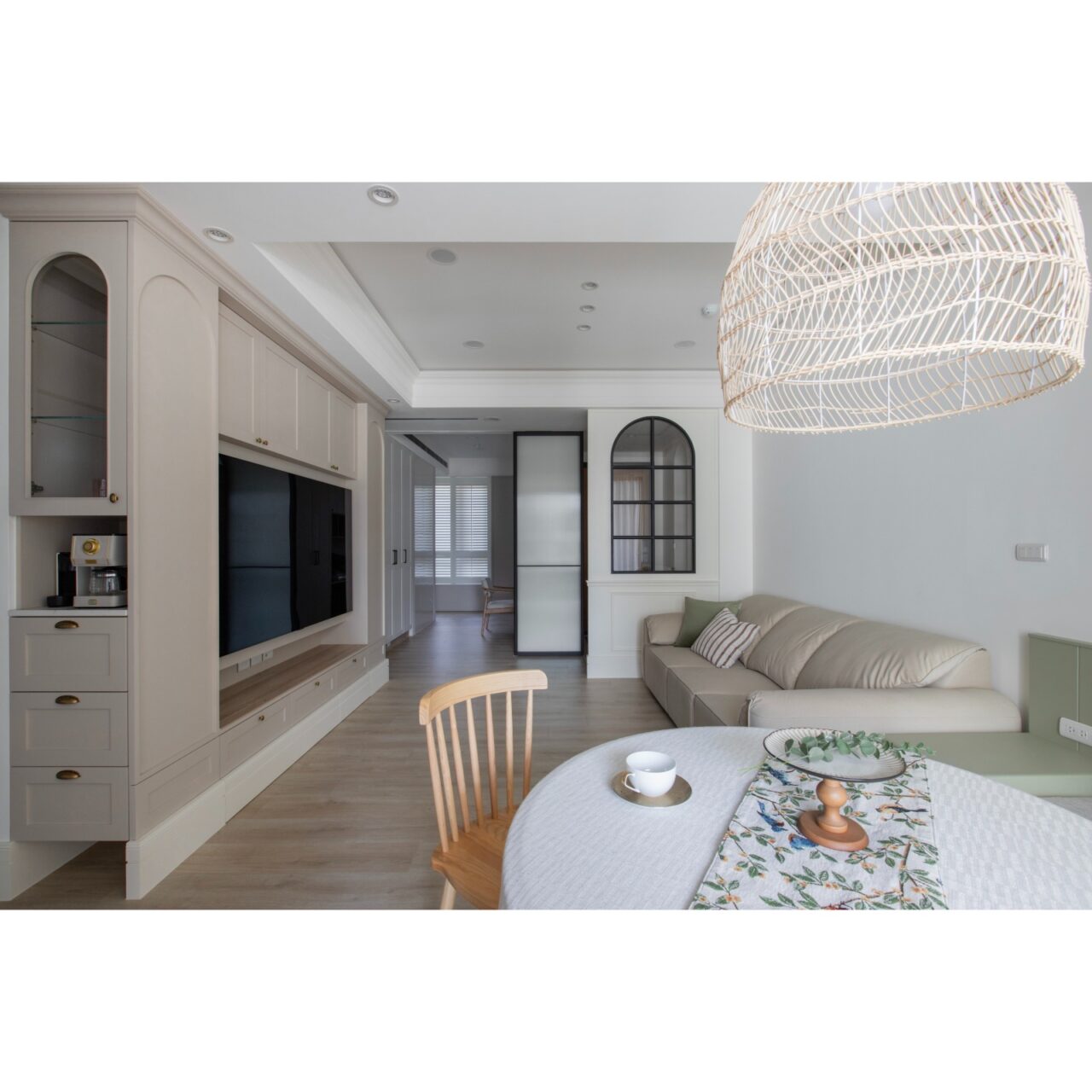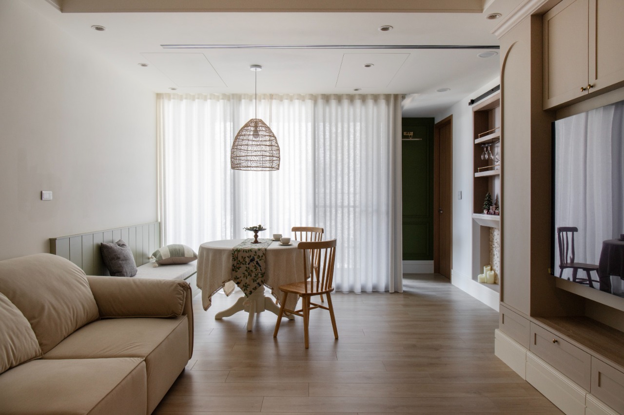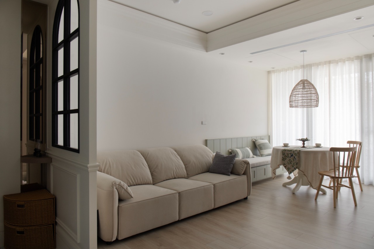The journey through this thoughtfully designed space begins at the entryway, where a striking partition wall artfully combines crisp white molding with elegant black iron arched window grilles. This fusion not only defines the entry zone but also preserves a sense of visual openness, inviting guests to step further inside. As one approaches, the captivating black-and-white patterned tiles lay down a vibrant welcome mat, while a recessed shoe bench, complete with hooks and shelves, harmonizes functionality with style for an efficient entry experience. Upon entering the living-dining area, one will be greeted by soft pink cabinetry that, alongside off-white walls, creates a warm and inviting atmosphere. The open layout effortlessly connects the dining and relaxation zones, fostering an inclusive environment perfect for social gatherings. The TV wall is a standout feature, showcasing a faux fireplace display shelf that adds a cozy ambiance. Moreover, the thoughtfully designed booth seating reduces the need for cumbersome chair movement, while cleverly transforming the kickboard area into convenient drawer storage, enhancing practicality without overwhelming the space.