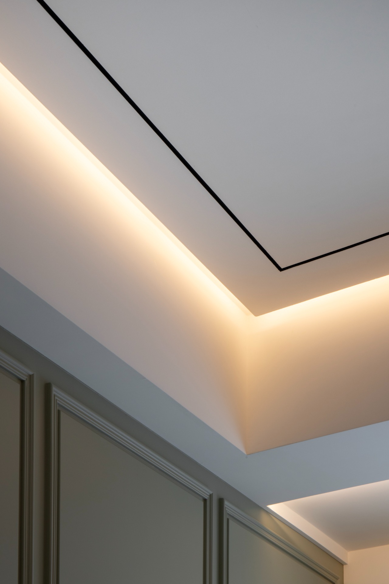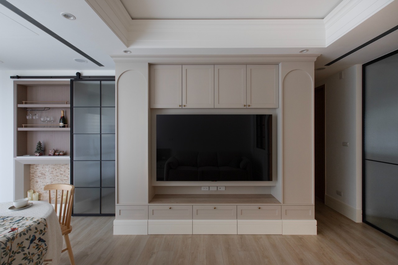 This residence beautifully embraces an American-style-inspired aesthetic while skillfully addressing the inherent tension between decorative elements and practical efficiency within compact living spaces. The thoughtful design transforms decorative features into a highly functional open-space layout, fostering a sense of both style and utility. Moreover, by seamlessly integrating moldings, cabinetry, and baseboards, the design enhances fluid circulation and maximizes storage efficiency. As a result, this approach not only provides visual harmony but also ensures practicality in the common areas. Ultimately, it creates a comfortable and uncluttered environment that is ideal for long-term living, inviting residents to enjoy both the beauty and functionality of their surroundings.