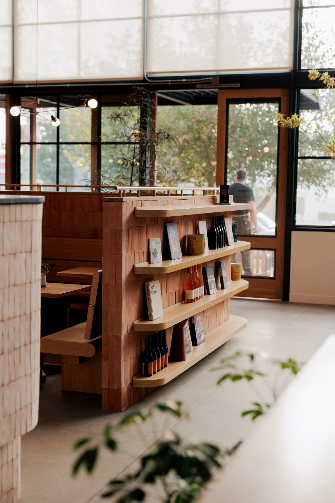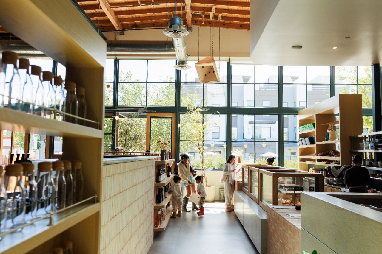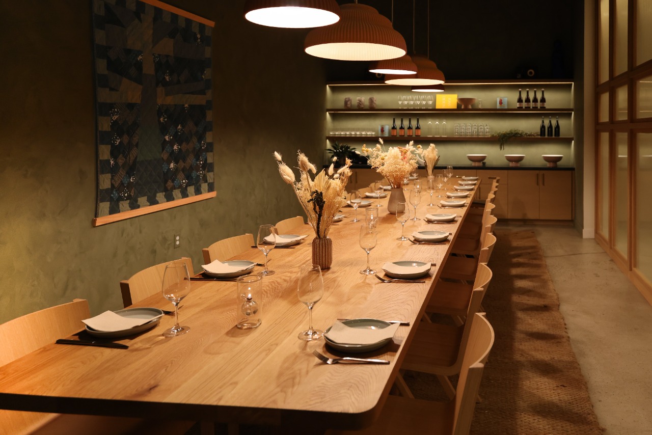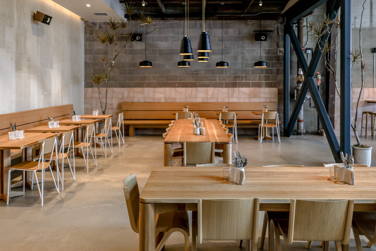 Housed in the original 1970’s Morey Boogie Boards factory, Wildland’s physical space is vast and sun-drenched, borrowing hues from the natural environment. In a rigorous process that played out over three years, everything but the cinderblock walls of the building was custom made to fit Wildland’s unique blend of woodsy comfort and coastal style. Walking through a patio flanked by two live oak trees, guests are drawn into the bustling action of the restaurant, with views of the bakery behind a long counter and pastry cases, a custom beige Mugnaini wood-fired oven anchored in the open kitchen, and a walk-up bar centered in the dining room. Sprawling floor-to-ceiling windows draw natural light into a warm space with rough concrete floors, handcrafted terra cotta tiles installed without grout and white rift oak millwork. Custom touches include textured Venetian plaster walls by San Diego-based plaster artist Sasha Seyb and a 10-foot painted tapestry of a desert landscape by Tyler Hays. The effect is one of constant discovery, allowing guests to have a unique spatial experience each time they visit Wildland, in a manner that mirrors the restaurant’s dynamic menu.