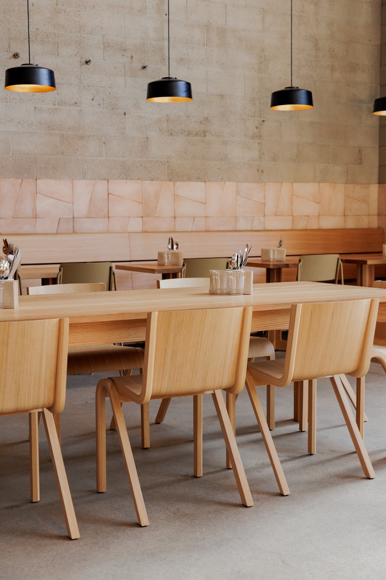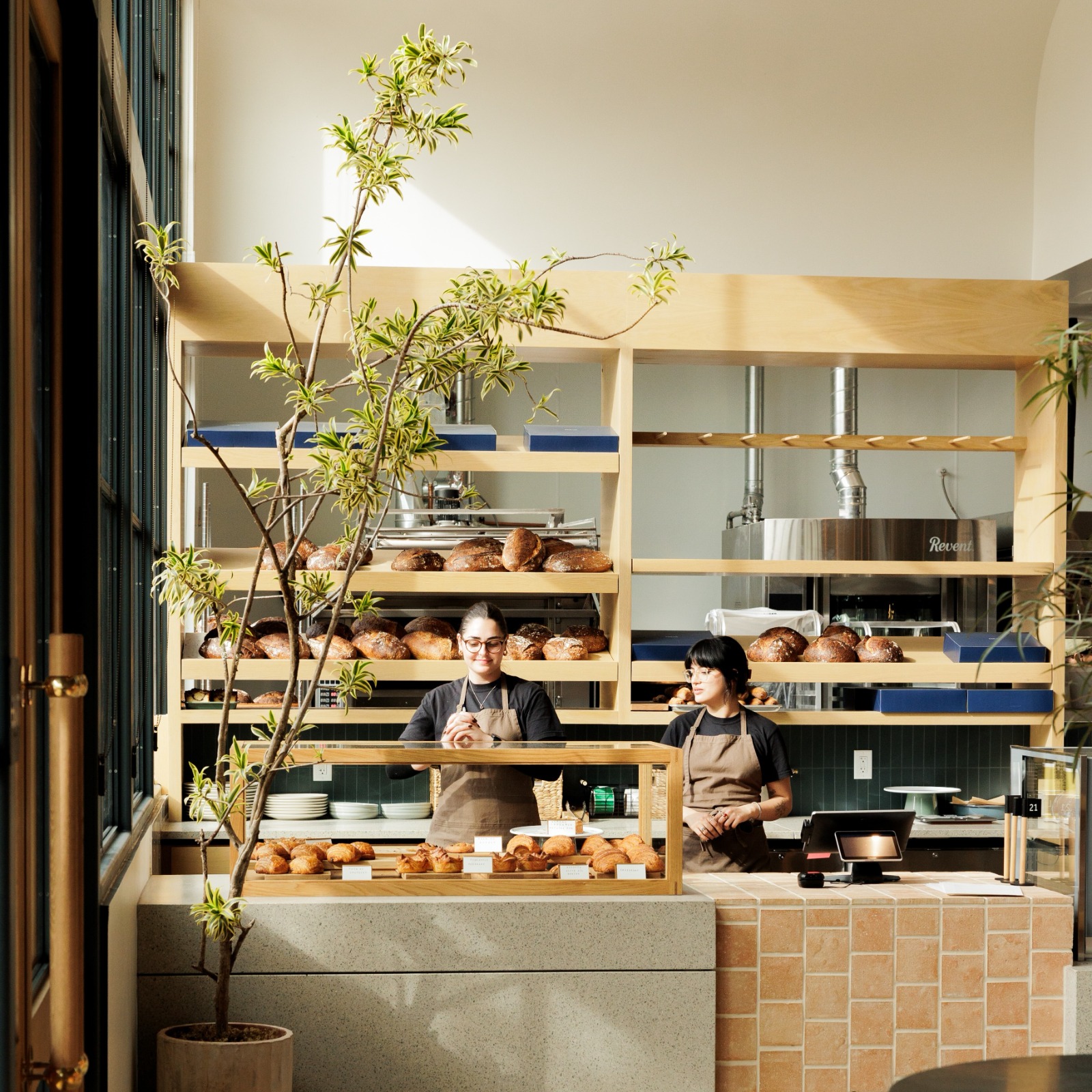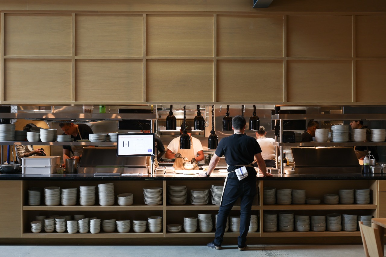 Housed in the original 1970’s Morey Boogie Boards factory, Wildland’s physical space is vast and sun-drenched, borrowing hues from the natural environment. In a rigorous process that played out over three years, everything but the cinderblock walls of the building was custom made to fit Wildland’s unique blend of woodsy comfort and coastal style. Walking through a patio flanked by two live oak trees, guests are drawn into the bustling action of the restaurant, with views of the bakery behind a long counter and pastry cases, a custom beige Mugnaini wood-fired oven anchored in the open kitchen, and a walk-up bar centered in the dining room. Sprawling floor-to-ceiling windows draw natural light into a warm space with rough concrete floors, handcrafted terra cotta tiles installed without grout and white rift oak millwork. Custom touches include textured Venetian plaster walls by San Diego-based plaster artist Sasha Seyb and a 10-foot painted tapestry of a desert landscape by Tyler Hays. The effect is one of constant discovery, allowing guests to have a unique spatial experience each time they visit Wildland, in a manner that mirrors the restaurant’s dynamic menu.